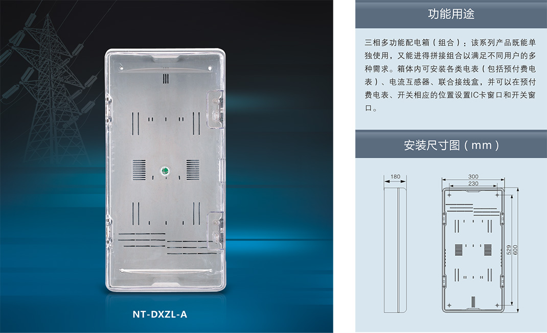 ,采用进口聚碳酸酯(PC)和阻燃ABS工程塑料制成。具有抗冲击、抗老化、耐腐蚀、透明度高、抗紫外线、安装方便等优点,并且具有用电安全保护,用户分离控制,数据采集, 防盗电等功能。产品适合安装电子式、机械式、智能IC卡预付式、智能多费率式电表。南腾NT系列透明