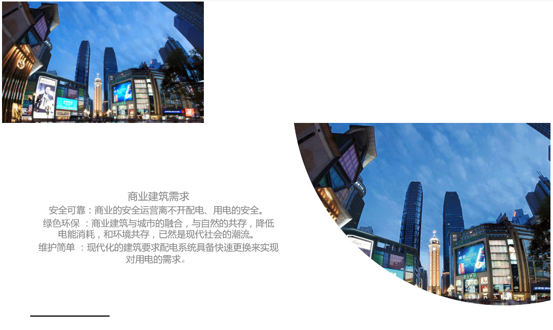 商业建筑包含供电部分、机电设备、消防系统等。强调选择性保护、安全可靠、绿色环保、维护简单,鸿坤连续多年服务于高端商业地产客户,为客户解决压力和挑战,能为商业建筑系统提供多种个性化解决方案,以确保安全、绿色、低成本用电。